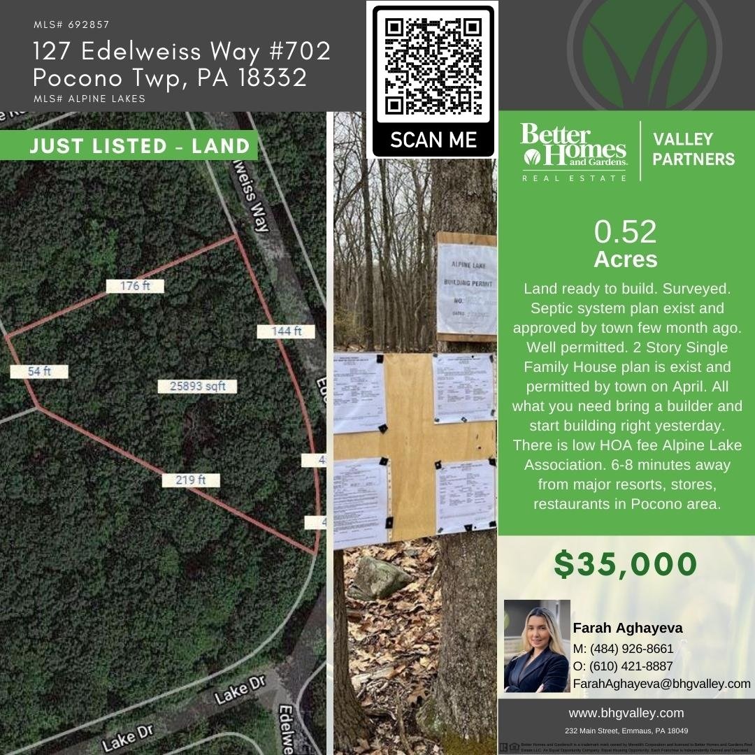 SOLD 127 Edelweiss Way LOT 702 Henryville, PA 1833 0.50 acre $28,000 MLS: 730599 Right in the heart of Pocono. Surveyed. Cleared. Permitted. Buildable. Land ready to build. Septic system plan exist and approved by township. Well permitted. 2 Story Single Family House plan is existing and permitted by township in April. All you need is to bring a builder. There is low HOA fee Alpine Lake Association. 6-8 minutes away from major resorts , stores, restaurants in Pocono area. Beautiful 0.50 acre Wooded lot in Alpine lake community. Conveniently Located Near Rt 611 & 380. Close to shopping, Kalahari, Camelback and much more. Come check it out today! Additional Lots for Sale is available. realtorfarah32@gmail.com (516) 508-3532